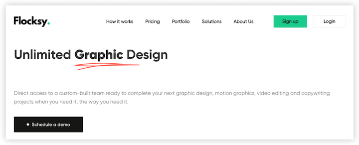 이와 관련된 또 다른 랜딩 페이지 디자인 트렌드는 무엇일까요? 바로 손글씨와 같은 글꼴 요소입니다. 아래는 그래픽 디자인 구독 회사인 Flocksy의 훌륭한 예시입니다.