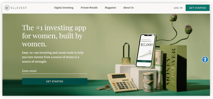녹색은 몇 년 전부터 인테리어 디자인에서 유행하고 있으며, 특히 헬스케어와 웰빙 관련 기업에서 항상 인기 있는 브랜드 컬러였습니다. 최근에는 다른 분야에서도 많이 사용되고 있습니다(위의 Squarespace 배경과 아래의 Ellevest 예시 참조).