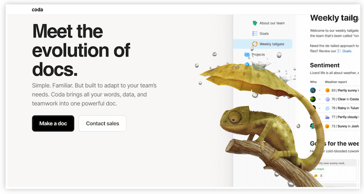 협업 문서와 리스트 작성을 위한 Notion과 유사한 도구인 Coda의 이 멋진 사례를 살펴보세요. 우산 꼬리를 가진 도마뱀의 사실적인 만화 비주얼이 나머지 중립적이고 현대적인 페이지와 멋진 대조를 이루며, 헤드라인이 재미있는 카피/디자인을 만들어 냅니다.