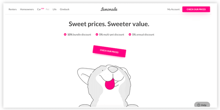 창의적인 카피라이팅을 고수하거나 디자인을 테스트해 볼 수 있습니다. 반려동물 보험 회사인 Lemonade는 이를 잘 활용하고 있습니다. 이 랜딩 페이지 디자인은 최소한의 검은색, 흰색, 회색 디자인에 움직이는 고양이와 개가 선으로 그려져 있으며, 브랜드의 밝은 분홍색 액센트와 버튼이 특징입니다. 그리고 이러한 요소 중 일부는 작은 애완동물과 버튼을 포함하여 페이지에서 서로 상호 작용합니다.