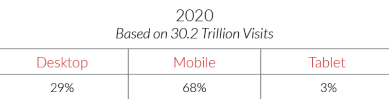 2020년 기준 전세계적으로 전체(데스크탑 + 태블릿 + 모바일) 웹사이트 방문 중 68.1%가 모바일 기기에서 일어났습니다.